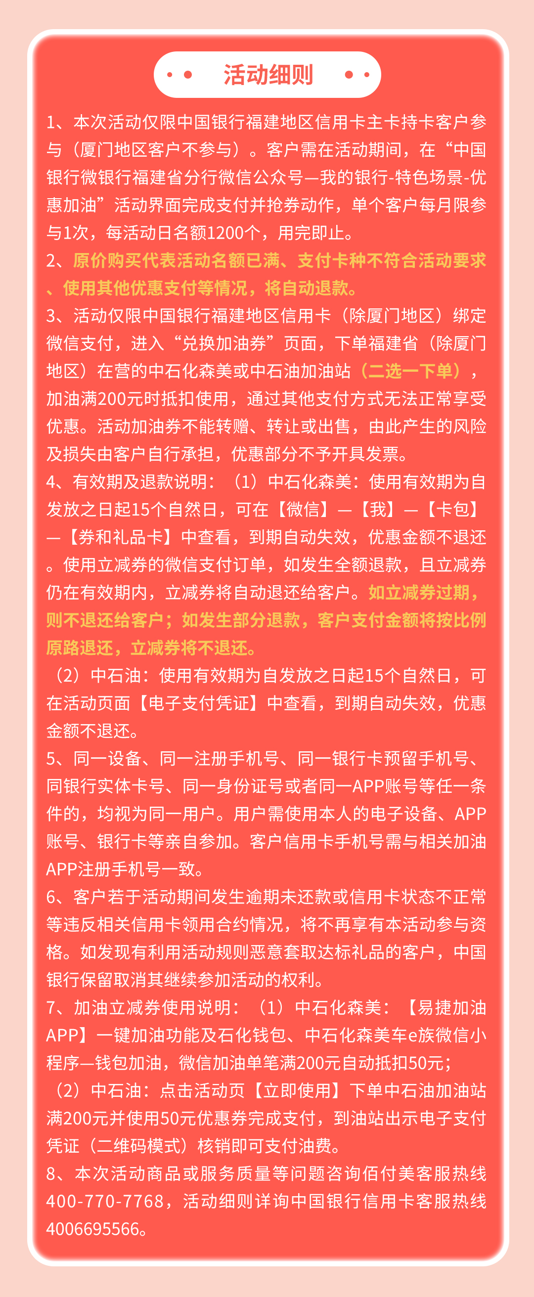 活动期间,客户通过“中国银行微银行福建省分行”微信公众号-我的银行-特色场景-优惠加油,可享20元抢购50元加油优惠券,客户可下单福建地区(不含厦门)指定在营中石化森美或中石油加油站,加油满200元时使用,优惠券有效期为15天。单客户每月限享一次优惠,每活动日名额1200个,用完即止。